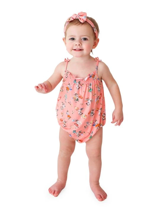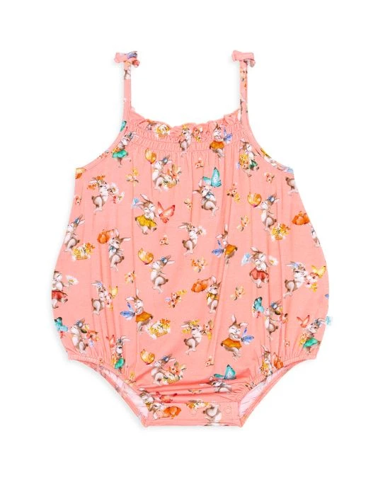 This Betty spaghetti strap bubble romper from Posh Peanut is lightweight, buttery soft, and designed with a bunny motif. Styled with a dainty bow strap detail, the ruched bodice sports a snap closure for easy diaper changes.