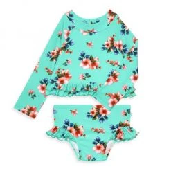 From the Aisha Collection. Posh Peanuts’ two-piece rashguard swim set is made of quick-drying, UPF 50+ fabric. This style includes a long-sleeve top and bottom styled with ruffled trim and a vibrant floral print. 80% nylon/20% spandex. Machine wash. Imported.
