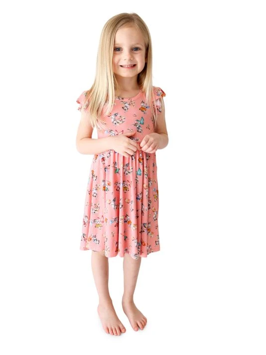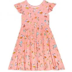 The Betty twirl dress from Posh Peanut sport large ruffle cap sleeves and a scoopneck. This garment is crafted of extra soft viscose and spandex, and is styled in a bunny print.
