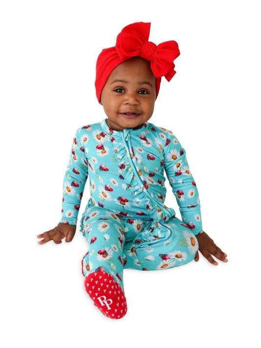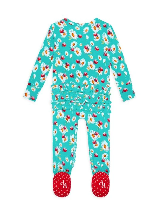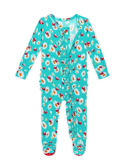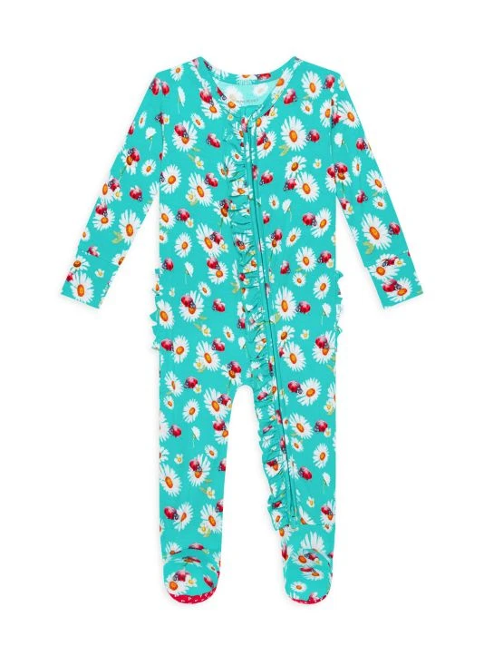 From the Ladybug Collection. This soft snug-fit footie in a ladybug and daisy print features a reversible zipper and ruffle details at the front.