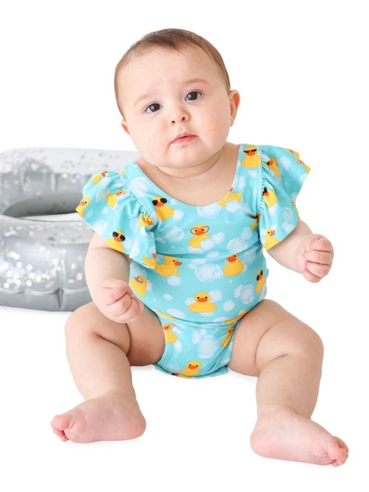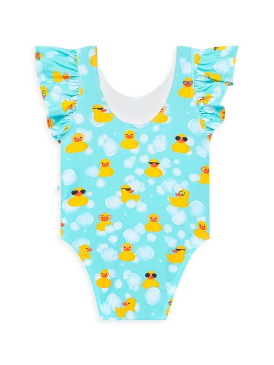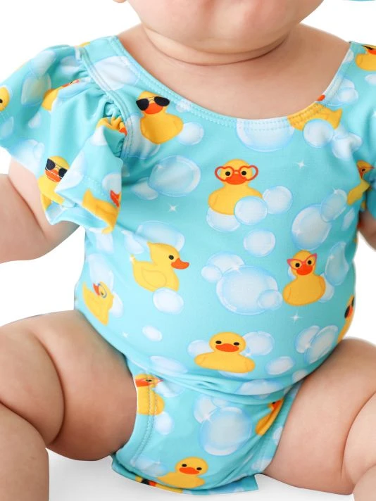 From The Ducky Collection. Crafted with UPF+ 50 fabrication, this ruffled sleeve swimsuit showcases a whimsical rubber ducky print.