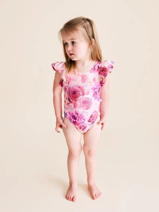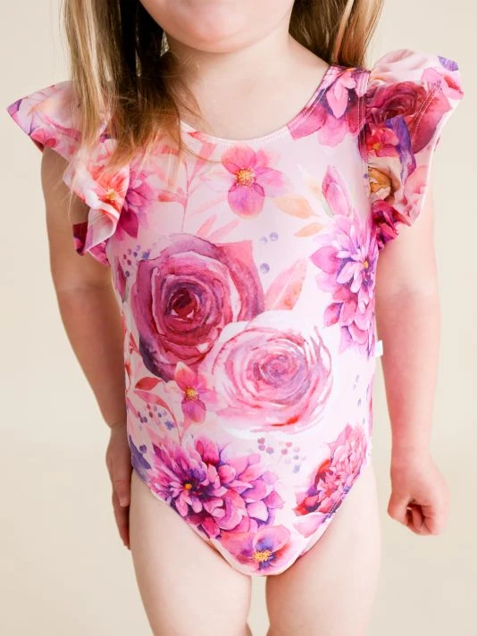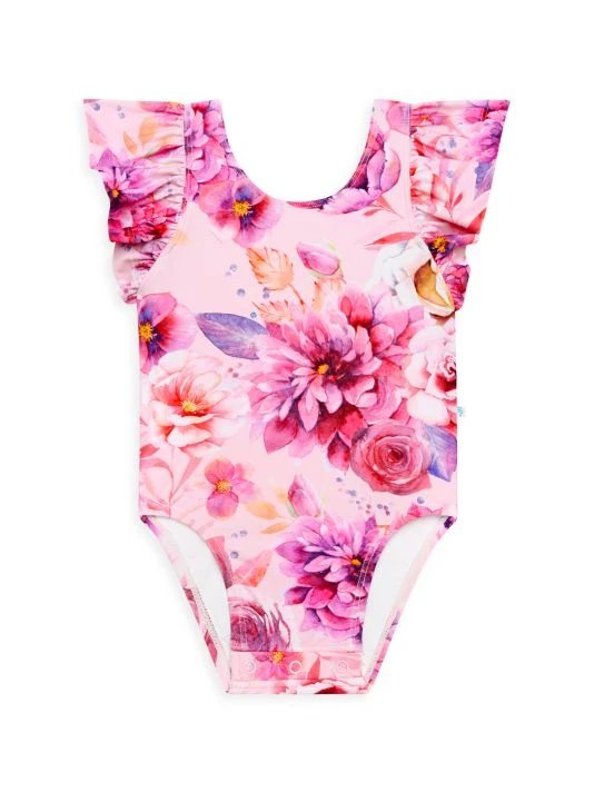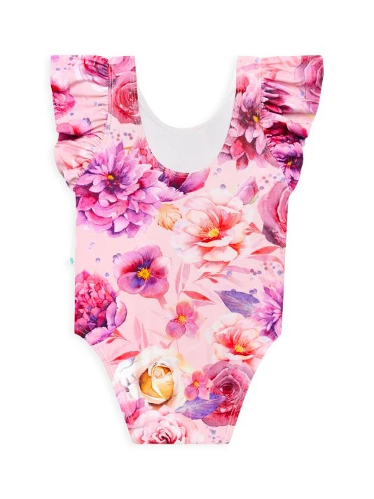 From The Amria Collection. Crafted with UPF+ 50 fabrication, this ruffled sleeve swimsuit flaunts a romantic floral print.