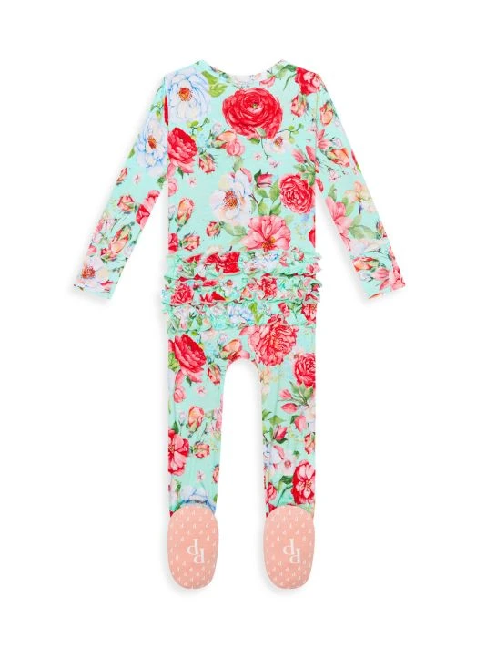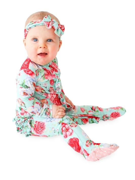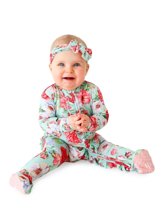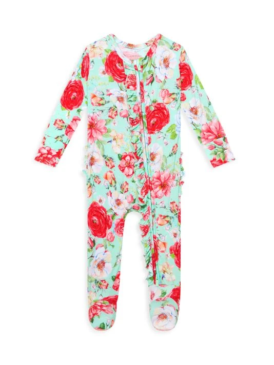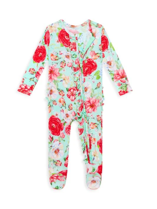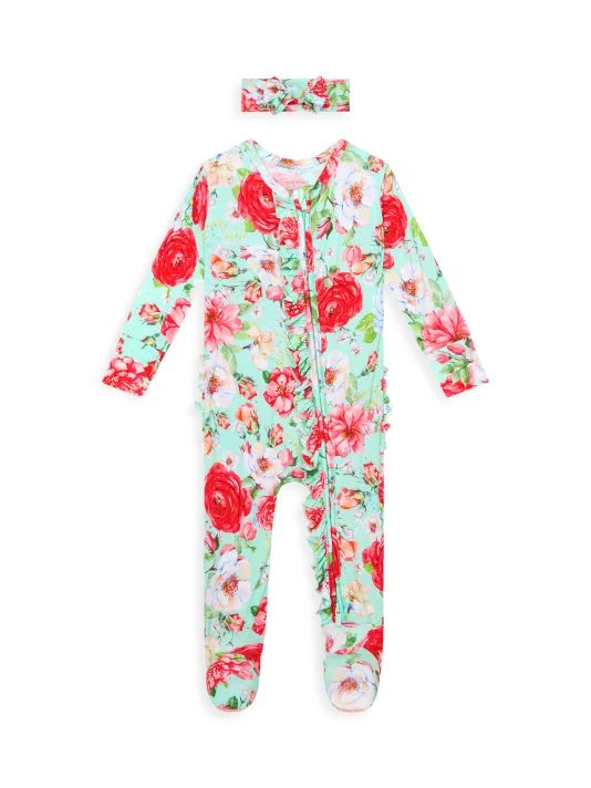 ONLY AT SAKS From the Pippa Collection. Signature viscose snug-fit one-piece ruffled footie features a reversible zipper opening and matching headwrap in a vibrant floral print.