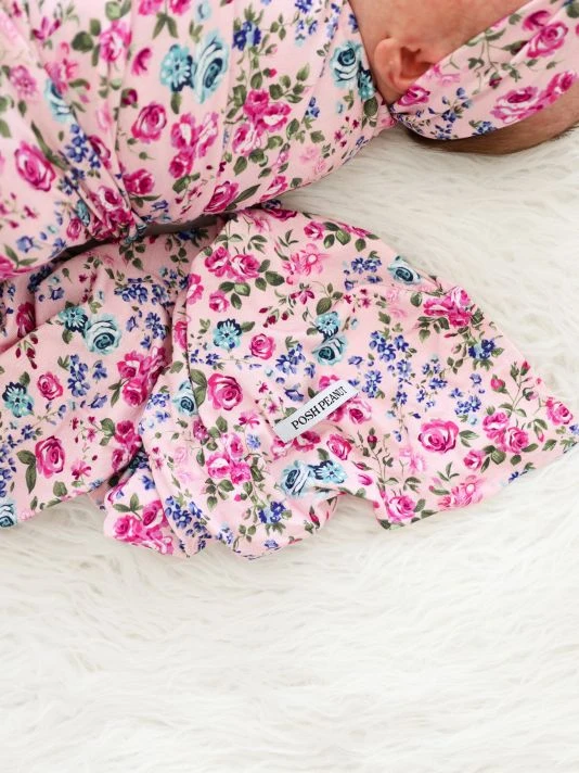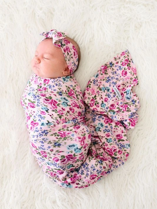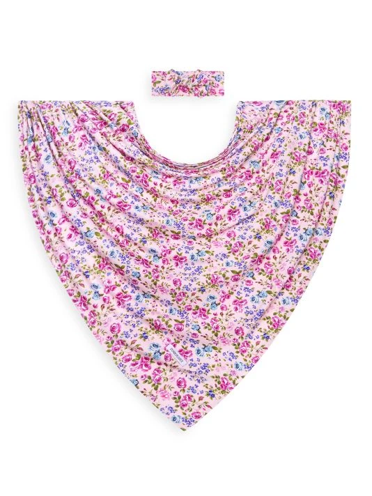 From the Pixie Collection. This two-piece set in the brand’s signature breathable and lightweight Päpook® fabric features a baby swaddle and a headwrap in a vibrant rose-inspired floral print.