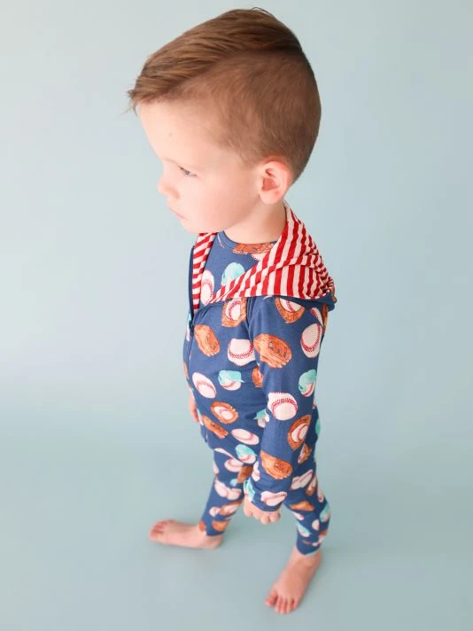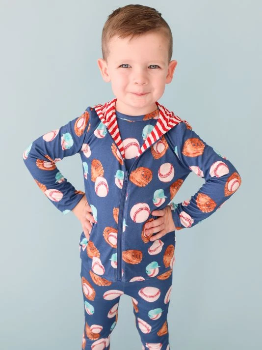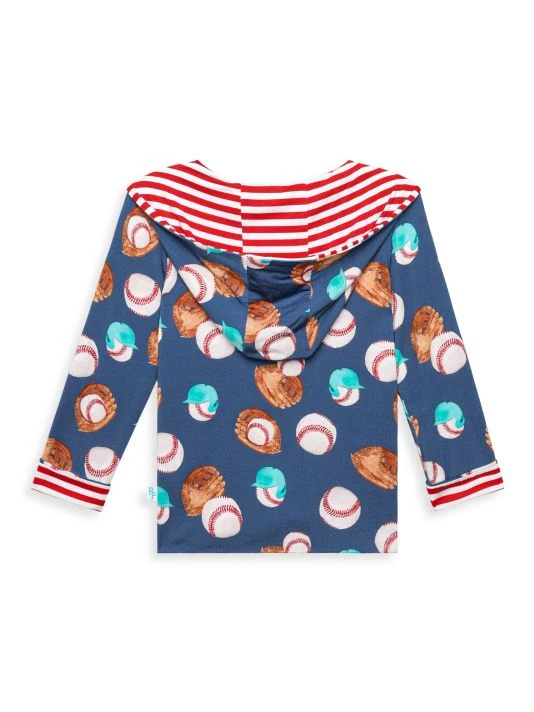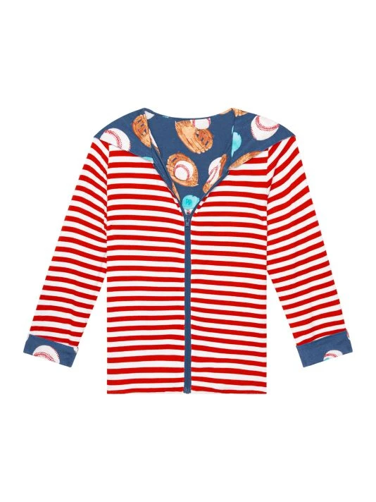 From the Homer Collection. The reversible Päpook hooded jacket is adorned with a baseball-inspired print and a striped print on the reverse side.