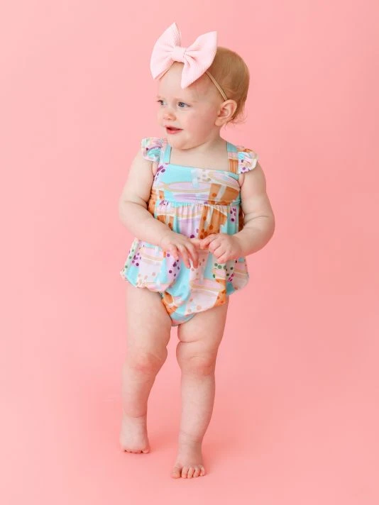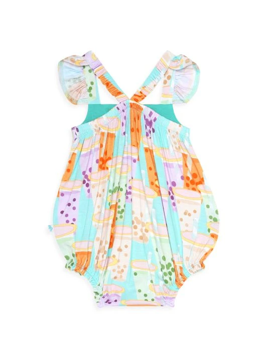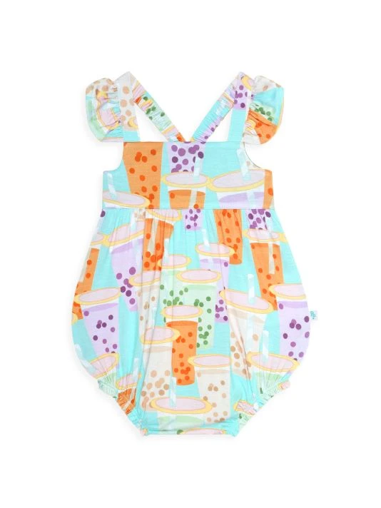 From the Boba Time Collection. Crafted of a Päpook® viscose blend, this bubble romper is styled with ruffle sleeves and a vibrant Boba Time print perfect for summertime.