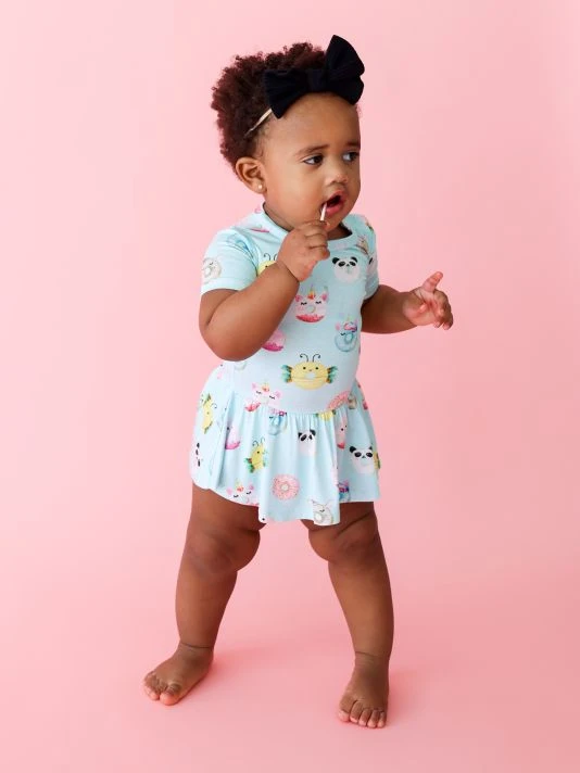 From the Donuts Collection. This short-sleeved bodysuit in a cartoon-inspired donut print features a twirl skirt detail.