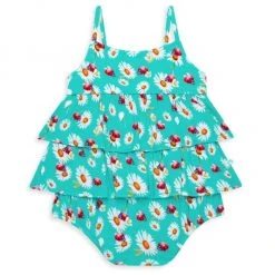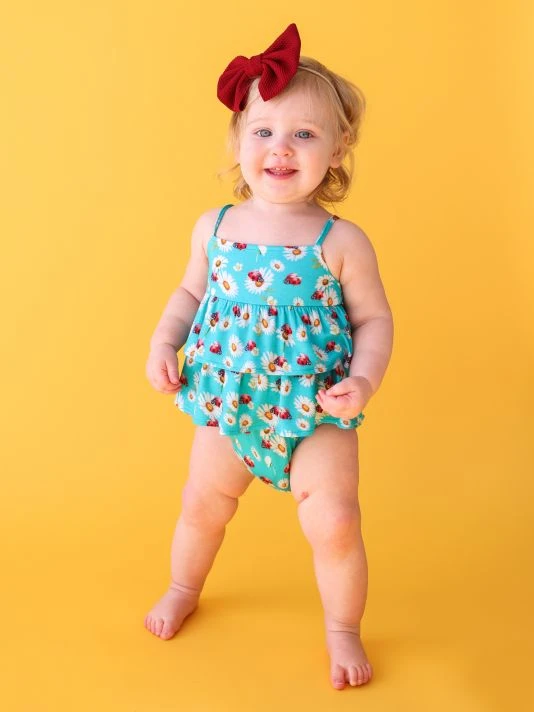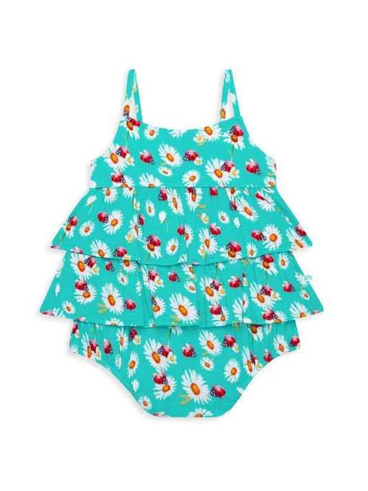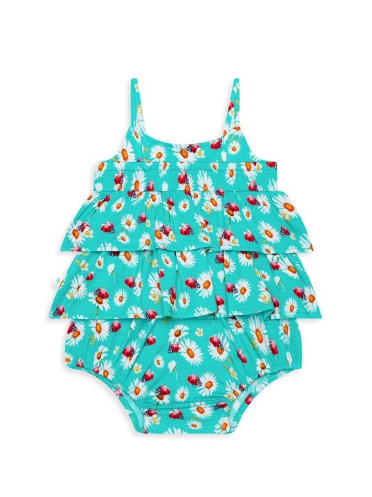 From the Ladybug Collection. This spaghetti strap bubble romper in a ladybug and daisy print is elevated with tiered ruffle details.