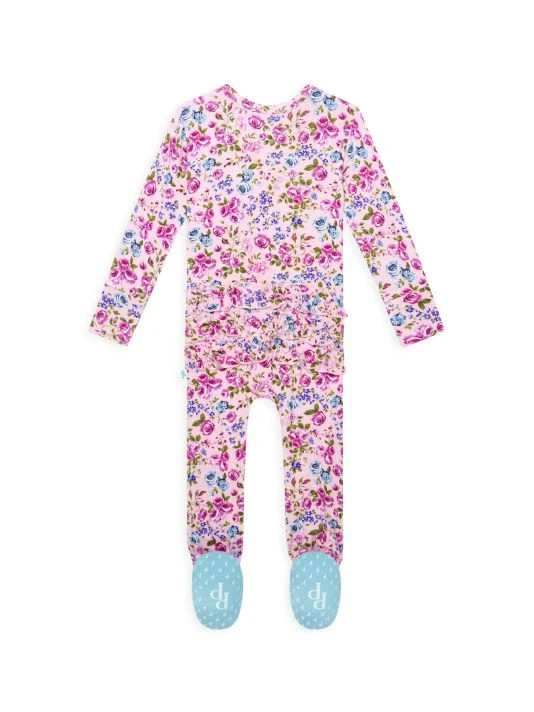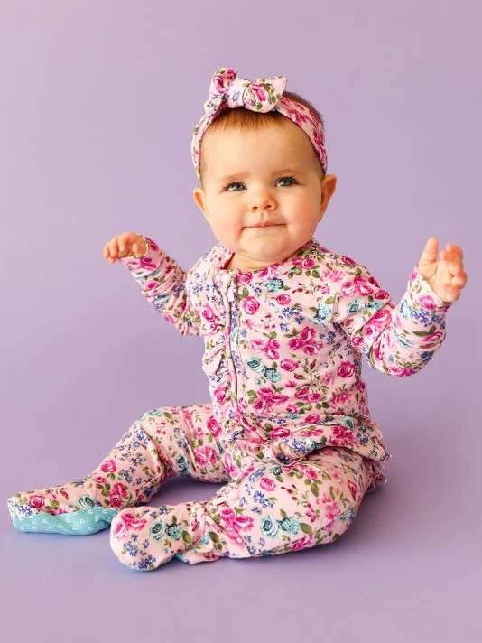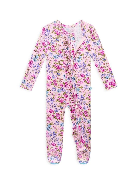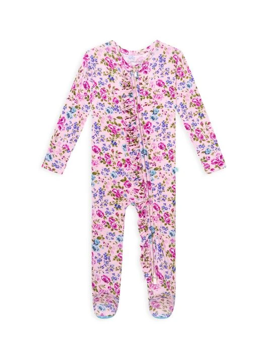 From the Pixie Collection. This snug-fit one-piece footie in a vibrant rose-inspired floral print with a reversible zipper features a ruffled bodice and Posh Peanut®’s signature non-slip grips on the footie for walkers.