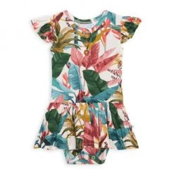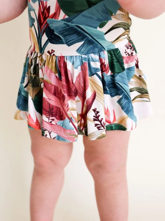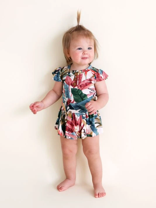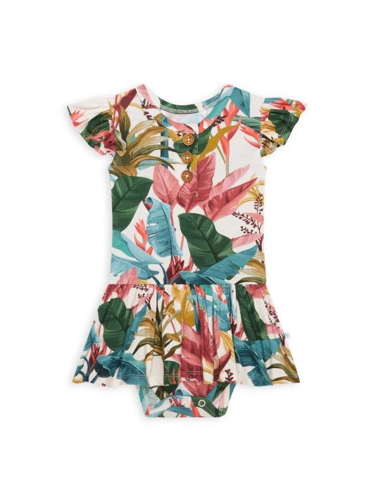 From the Tropicana Collection. For their latest collection, the coveted kidswear brand offers an assortment of whimsical prints from the Tropicana Collection complemented by their beloved, plush Patooâ„¢ blankets, and loungewear options for the whole family. This henley-style twirl skirt bodysuit in a tropical-inspired leaf print features wood functional buttons and ruffle cap sleeves.