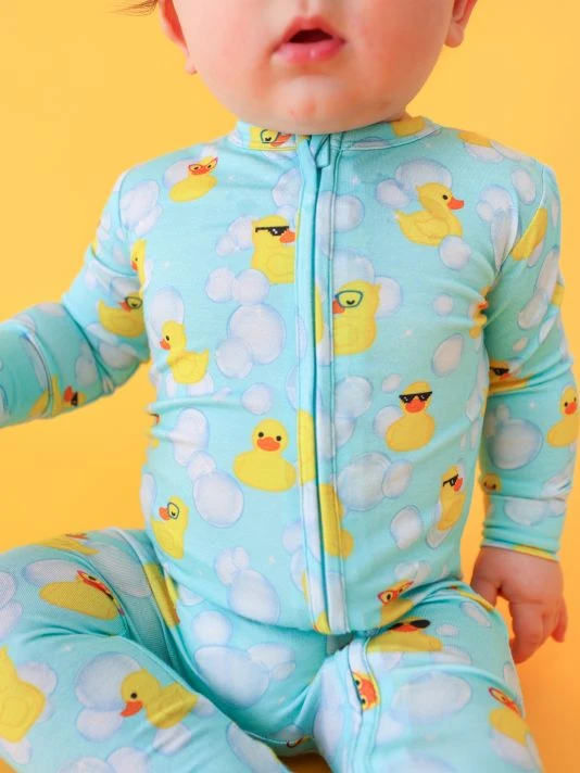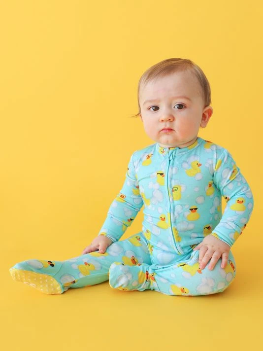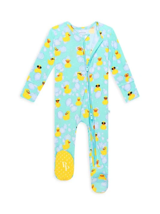 From the Ducky Collection. This soft snug-fit one-piece footie with a reversible zipper features Posh Peanut®’s signature non-slip grips on the footie for walkers and rubber ducky print.