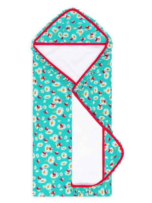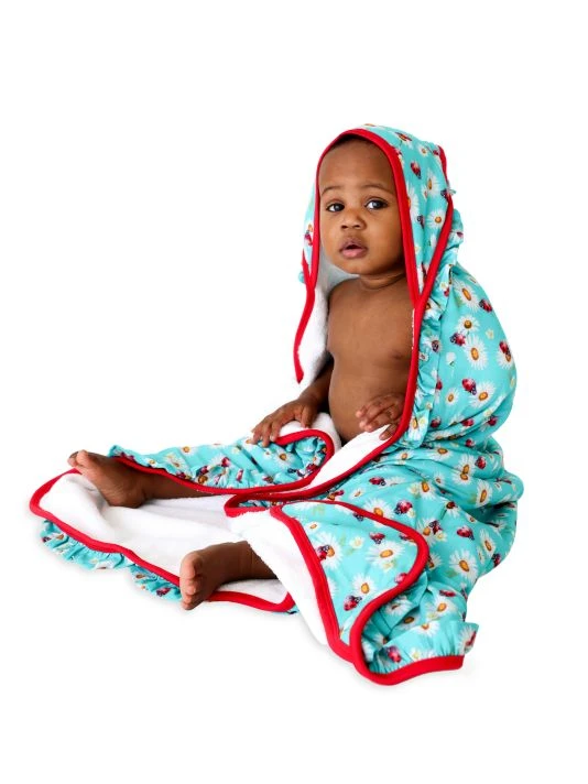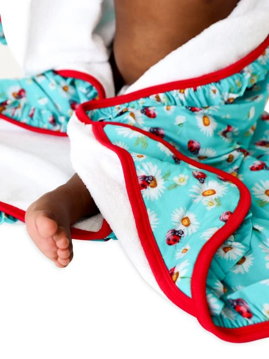 From the Ladybug Collection. Made of the brand’s signature Päpook®, the hooded towel with ruffle detail is adorned with a ladybug and daisy print.