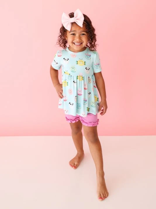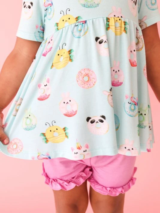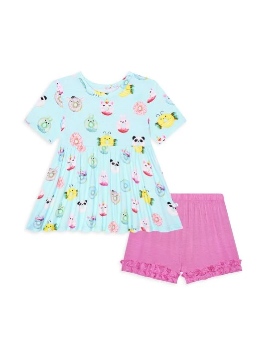 From the Donuts Collection. This two-piece set includes a short-sleeved peplum top in a cartoon-inspired donut print and ruffled shorts. 95% viscose/5% spandex. Machine wash. Imported.