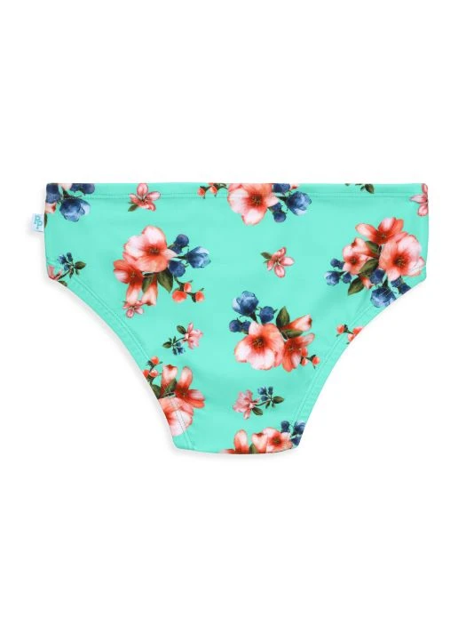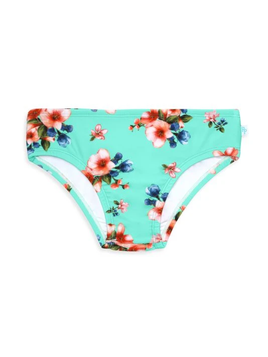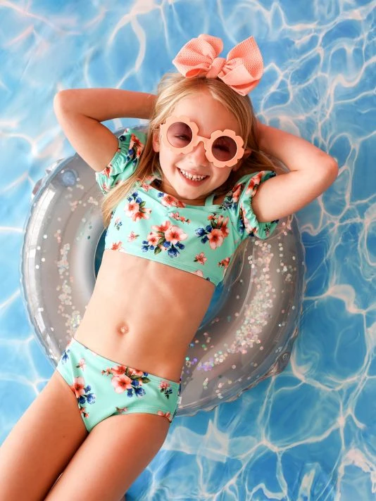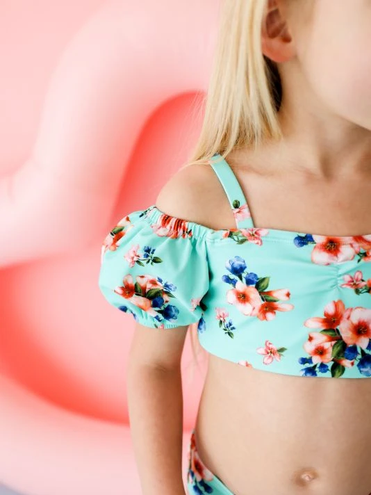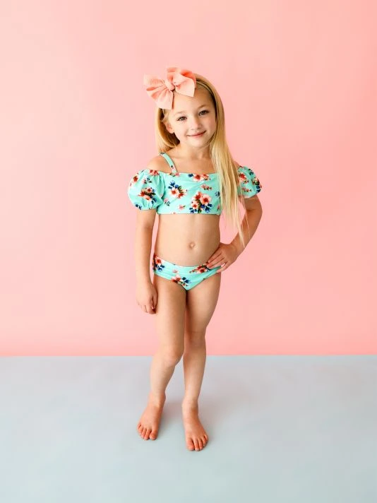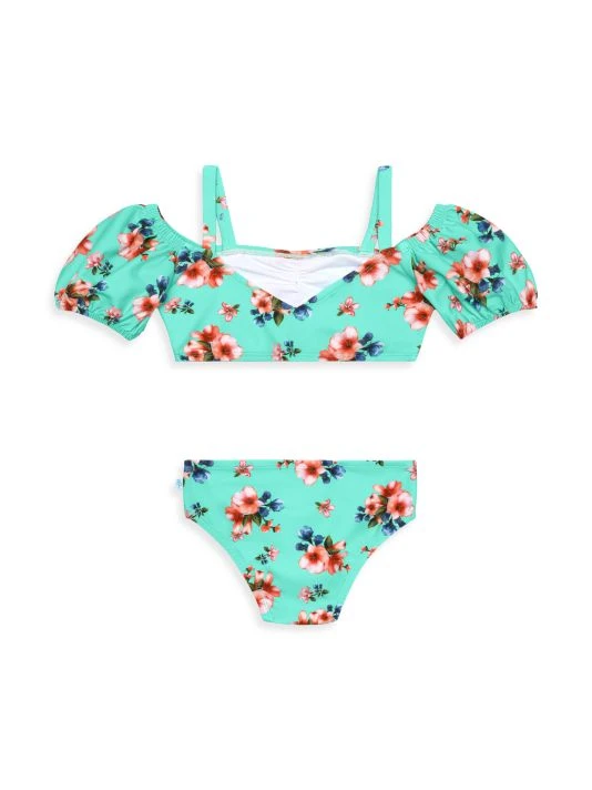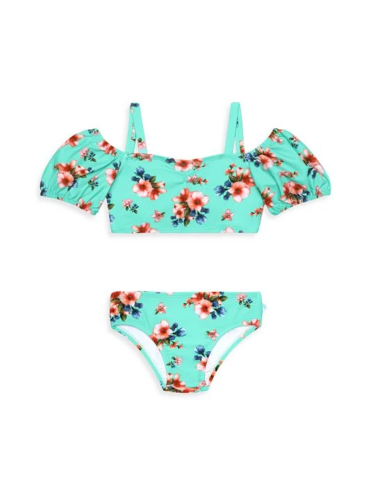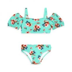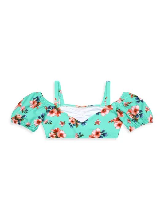 From the Aisha Collection. This two-piece swimsuit bikini set includes a puff sleeve top and bottoms in a floral print. 80% nylon/20% spandex. Machine wash. Imported.