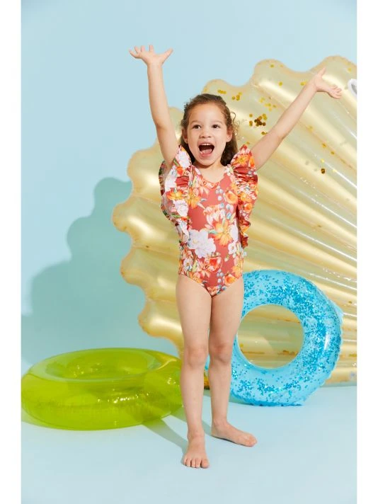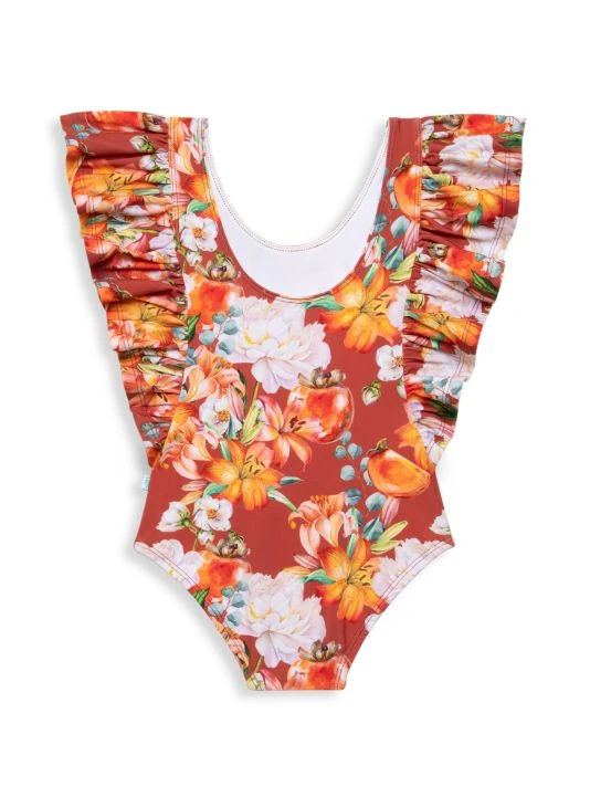ONLY AT SAKS. A floral print one-piece swimsuit featuring fun, ruffled-flutter sleeves and sun-blocking fabric.