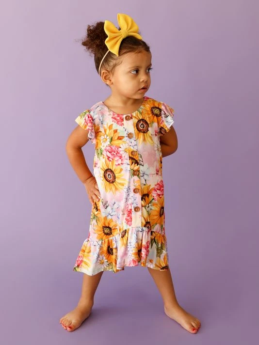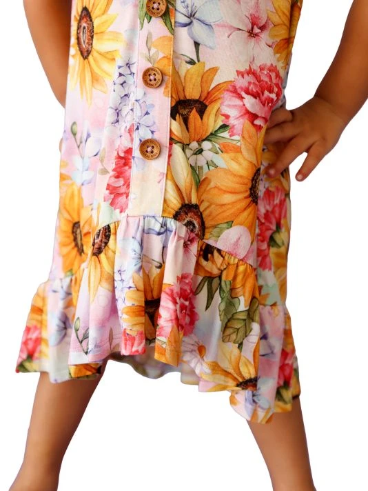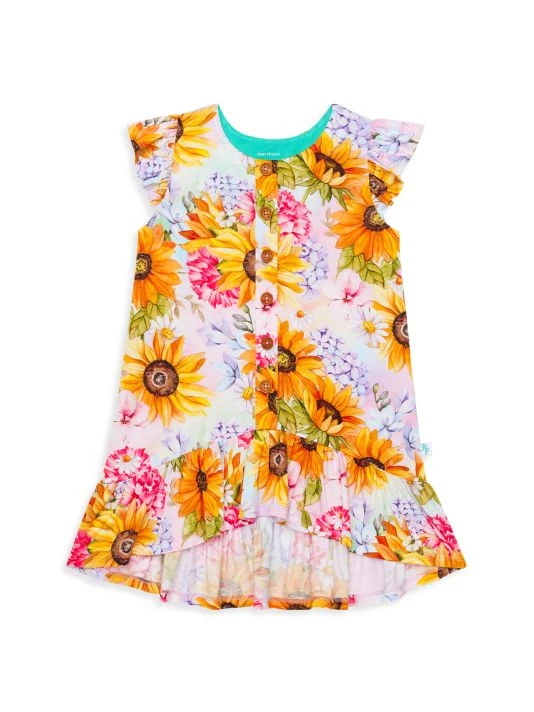 From The Summer Collection. A hi-lo ruffle trim and vibrant floral illustrations enhance this casual dress.